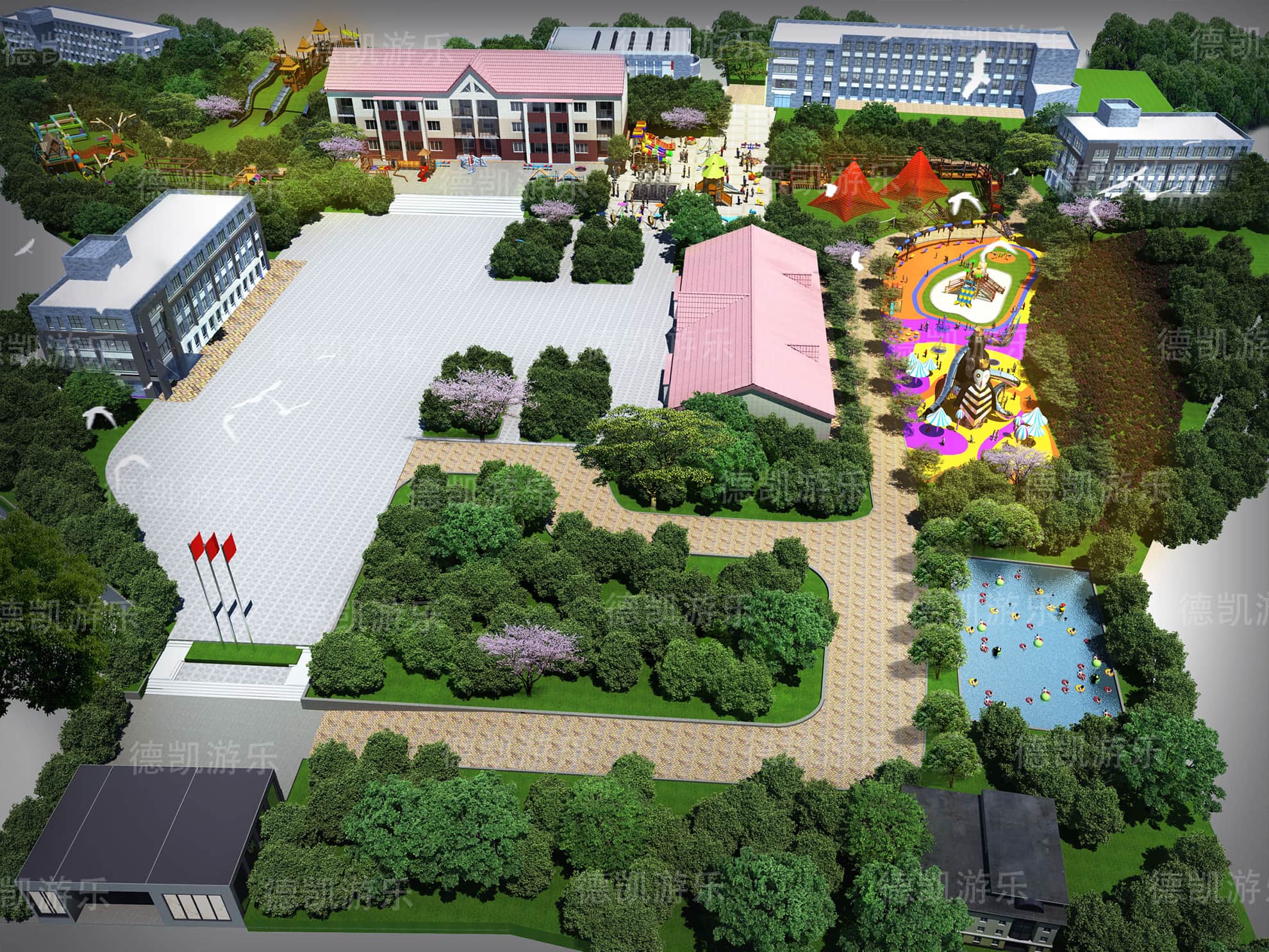 對(duì)于這個(gè)園子而言,它是屬于學(xué)校配套了,它里面的設(shè)備對(duì)孩子們的年齡段就沒(méi)有那么大了,年齡段應(yīng)該在2-15為主,可以包括幼兒園、小學(xué)、初中。在下課之后,游樂(lè)區(qū)域會(huì)擠滿了孩子們的身影,他們?cè)谶@里追逐、打鬧,玩耍,爭(zhēng)分奪秒地過(guò)著下課時(shí)間。在這個(gè)效果圖里面,完全可以看見(jiàn)企鵝滑梯、組合滑梯、城堡滑梯、勇攀高峰等比較大型的游樂(lè)設(shè)備,從周圍環(huán)境可以清晰的看見(jiàn)許多的教學(xué)樓,因此這個(gè)學(xué)校的孩子數(shù)量就會(huì)相對(duì)來(lái)說(shuō)比較的多,這些游樂(lè)設(shè)備能夠得到很好的利用。