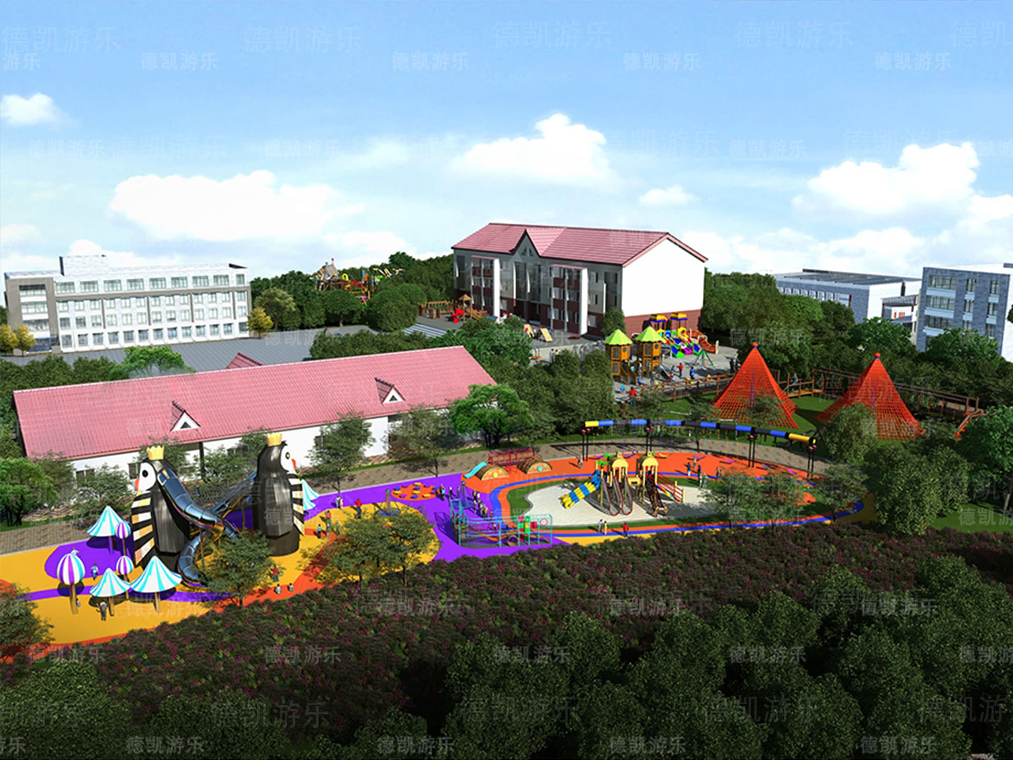 在這個(gè)效果圖里面,憨態(tài)可掬的企鵝夫妻滑梯,時(shí)時(shí)刻刻吸引著孩子們的眼球,孩子們從企鵝腳下鉆進(jìn)企鵝的身體,再?gòu)亩淅锩婊鰜?lái),孩子們積極好動(dòng)被企鵝帶動(dòng)了起來(lái)。旁邊的蘑菇傘、蘑菇包絢麗的顏色就像一顆顆夢(mèng)幻的棒棒糖,弧形秋千承載著孩子們的飛天夢(mèng),小拓展堆積著孩子們的歡樂(lè)時(shí)光。也許這個(gè)園子不是最出色的,但是卻讓這個(gè)學(xué)校的孩子們都能暢玩一番。