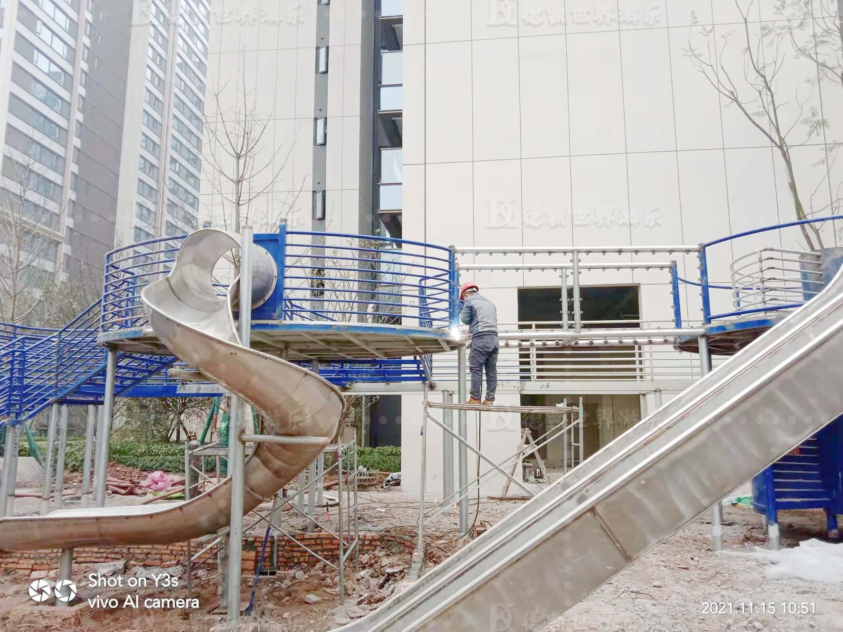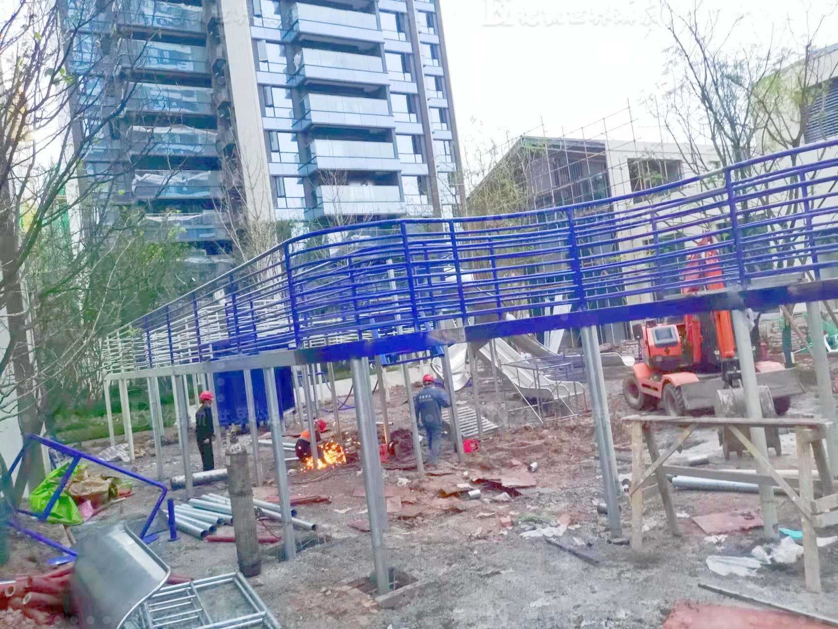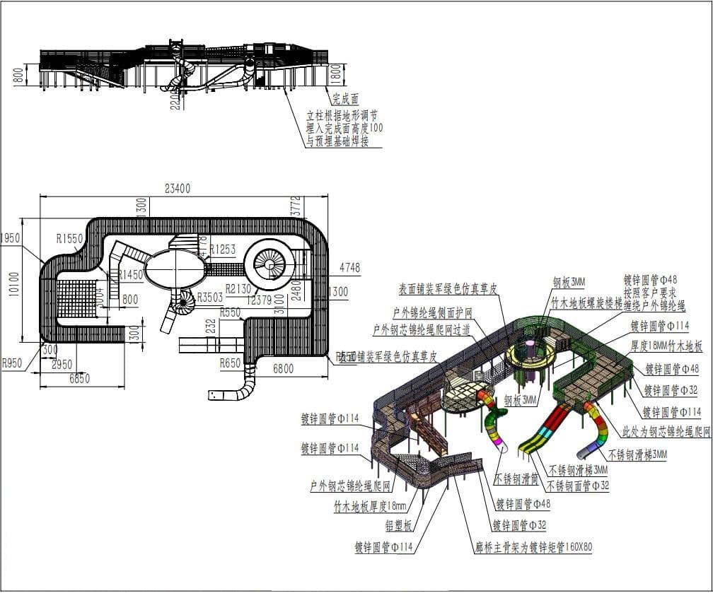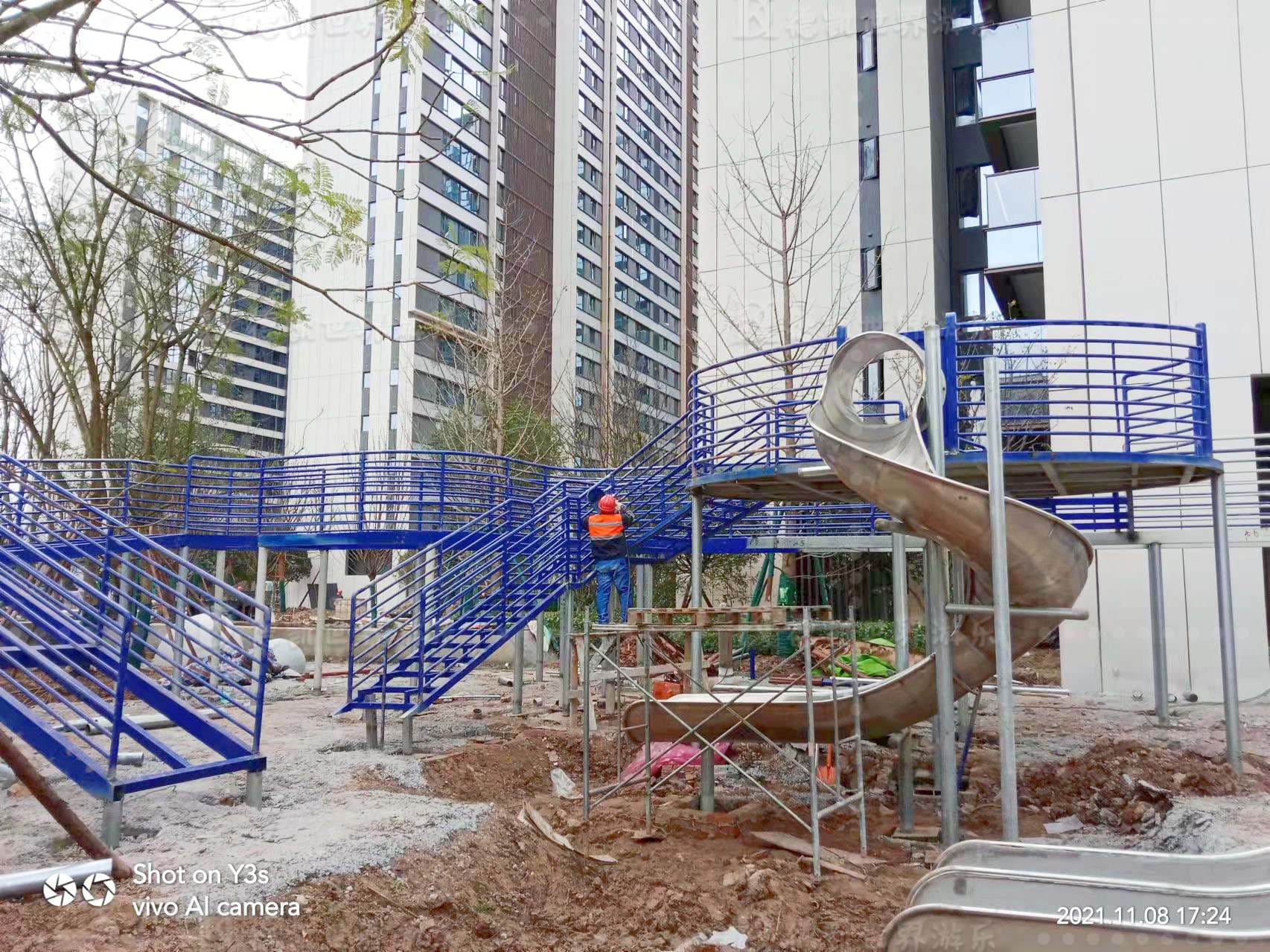 招商時代公園大體量設施當屬多功能廊架,功能包括:滑梯,拓展攀爬網,廊道,旋轉樓梯,秋千等。整個方案從效果圖到樣圖一出得到客戶一致好評。