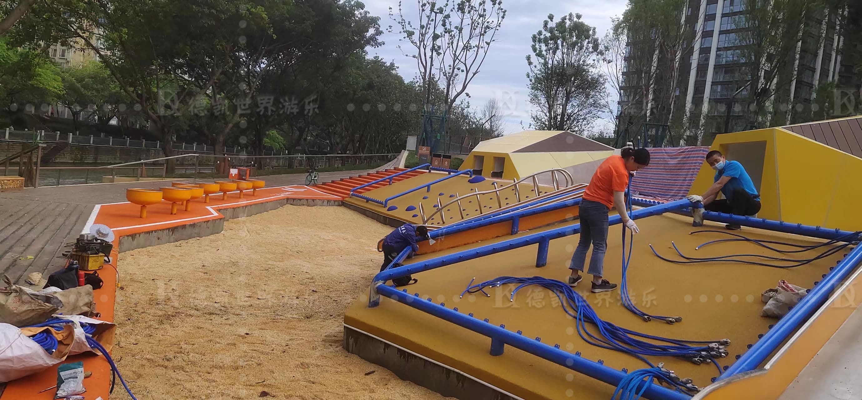 成都濱河公園游樂設施安裝完工,本著休閑娛樂,拓展運動為主。游樂設施涉及蹦床、滑梯、沙池、攀爬繩網(wǎng)、其它單品等,滿足不同年齡段人群互動體驗。