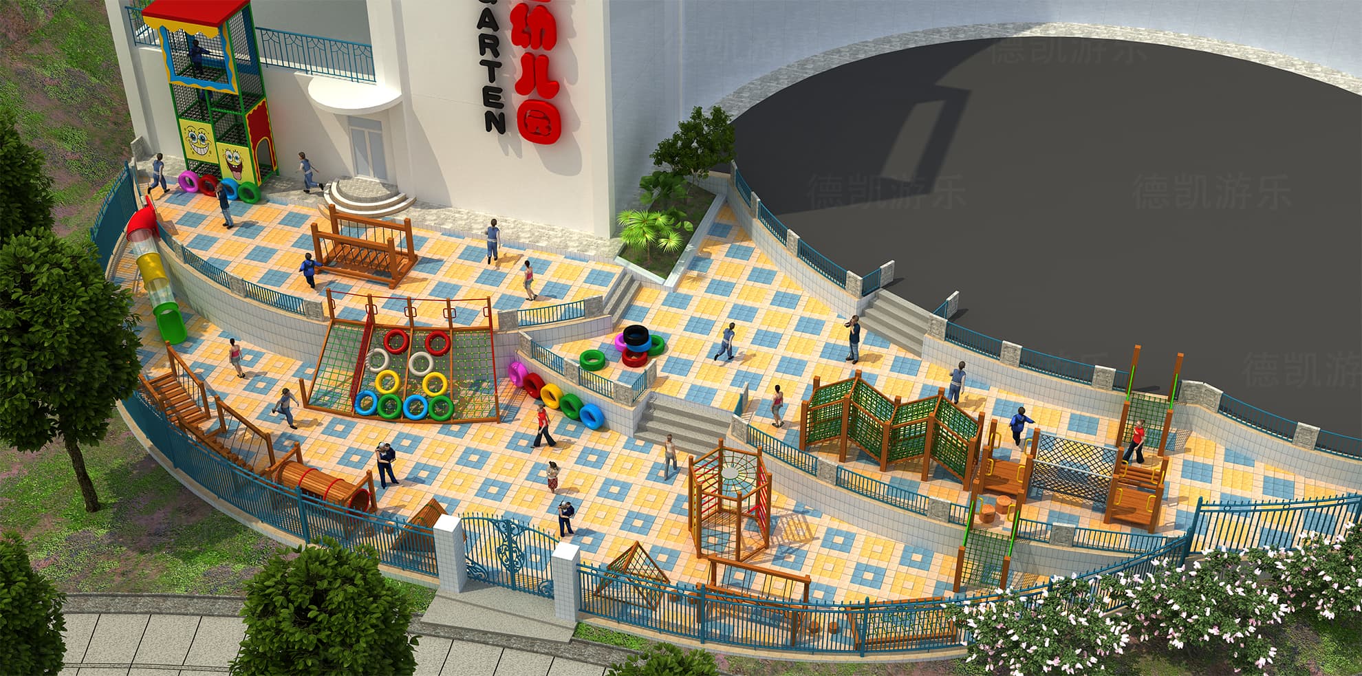 鳥(niǎo)瞰效果圖從園子的側(cè)面生動(dòng)刻畫(huà)了游樂(lè)設(shè)備的細(xì)節(jié)。蕩橋、鉆桶、爬網(wǎng)、拓展組合、滑桶等,東西雖然不多,但是特別的精致和實(shí)用。這個(gè)園子的主要玩耍人群是幼兒園的小孩子們,年齡較小,自我保護(hù)能力和冒險(xiǎn)精神尚未達(dá)到更高,所以這種園子很符合這個(gè)幼兒園。同時(shí)簡(jiǎn)單、雅致的游樂(lè)設(shè)備很受家長(zhǎng)們的青睞,也讓家長(zhǎng)們很放心在里面玩耍。